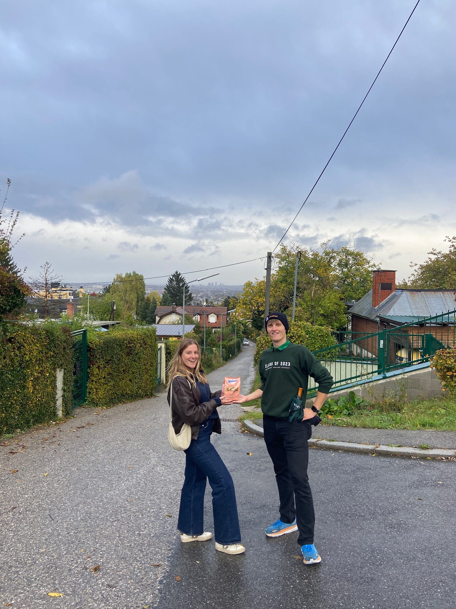 Emma grew up in Vienna, so we left the cafe and took the metro to see her childhood home and school in Heitzing! It was in Woop (middle of nowhere), though it was very cute and cozy. It honestly reminded me a bit of Pravdinsk (my grandma’s village in Belarus) with its gravel roads and houses. We got some waffle crackers and Milka chocolates, then hiked up Emma’s super steep childhood street to see the view of Vienna from the top.