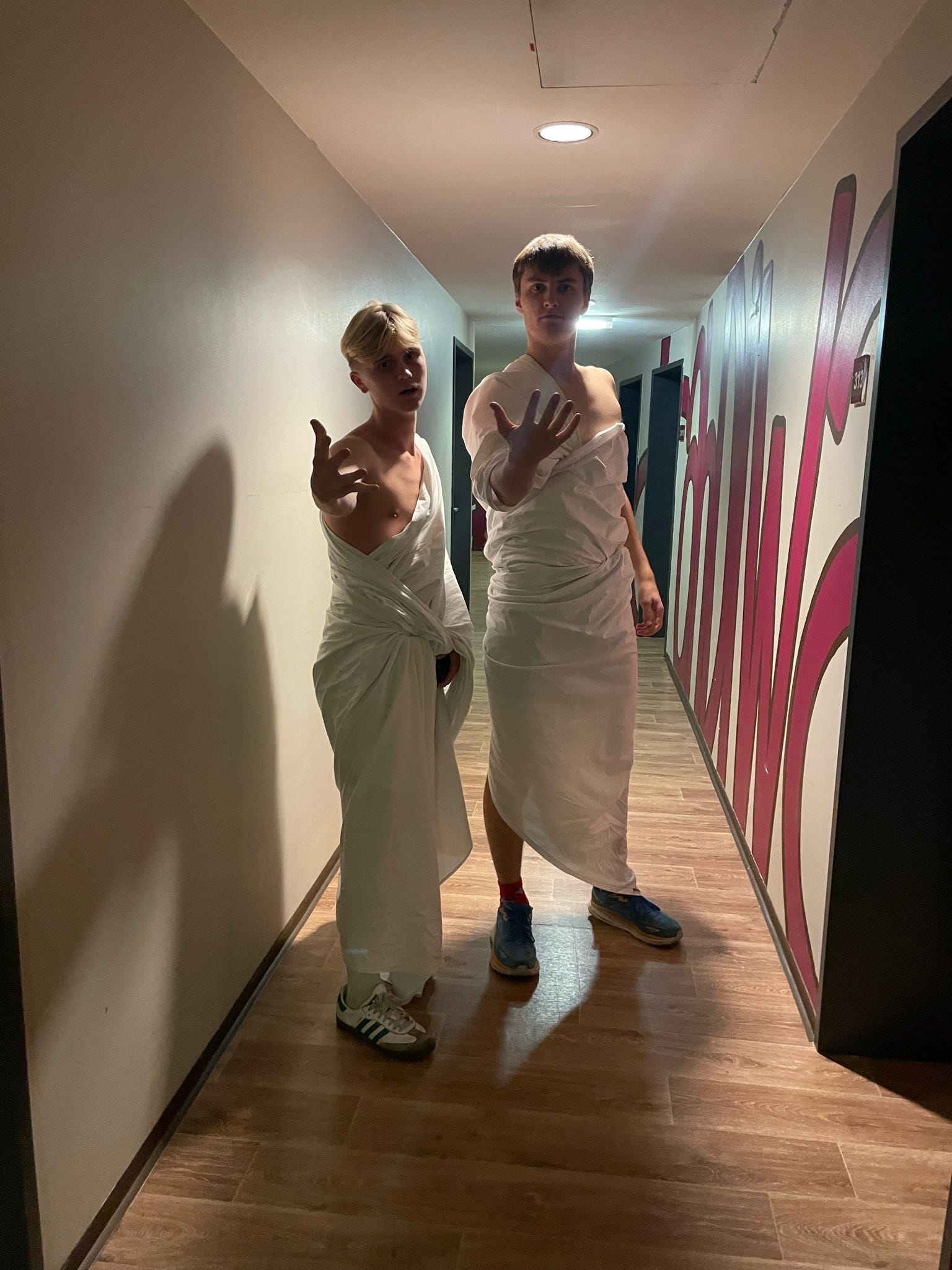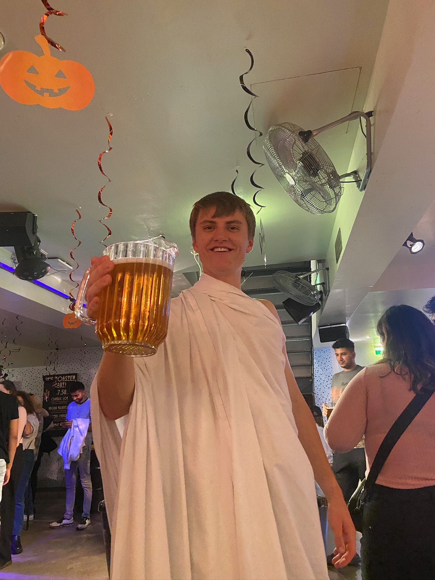 Joe and I went with the more creative, dramatically more low-budget option of Greek gods (or Roman senators) wearing togas made from bedsheets. Our mate Carlo was a cow!