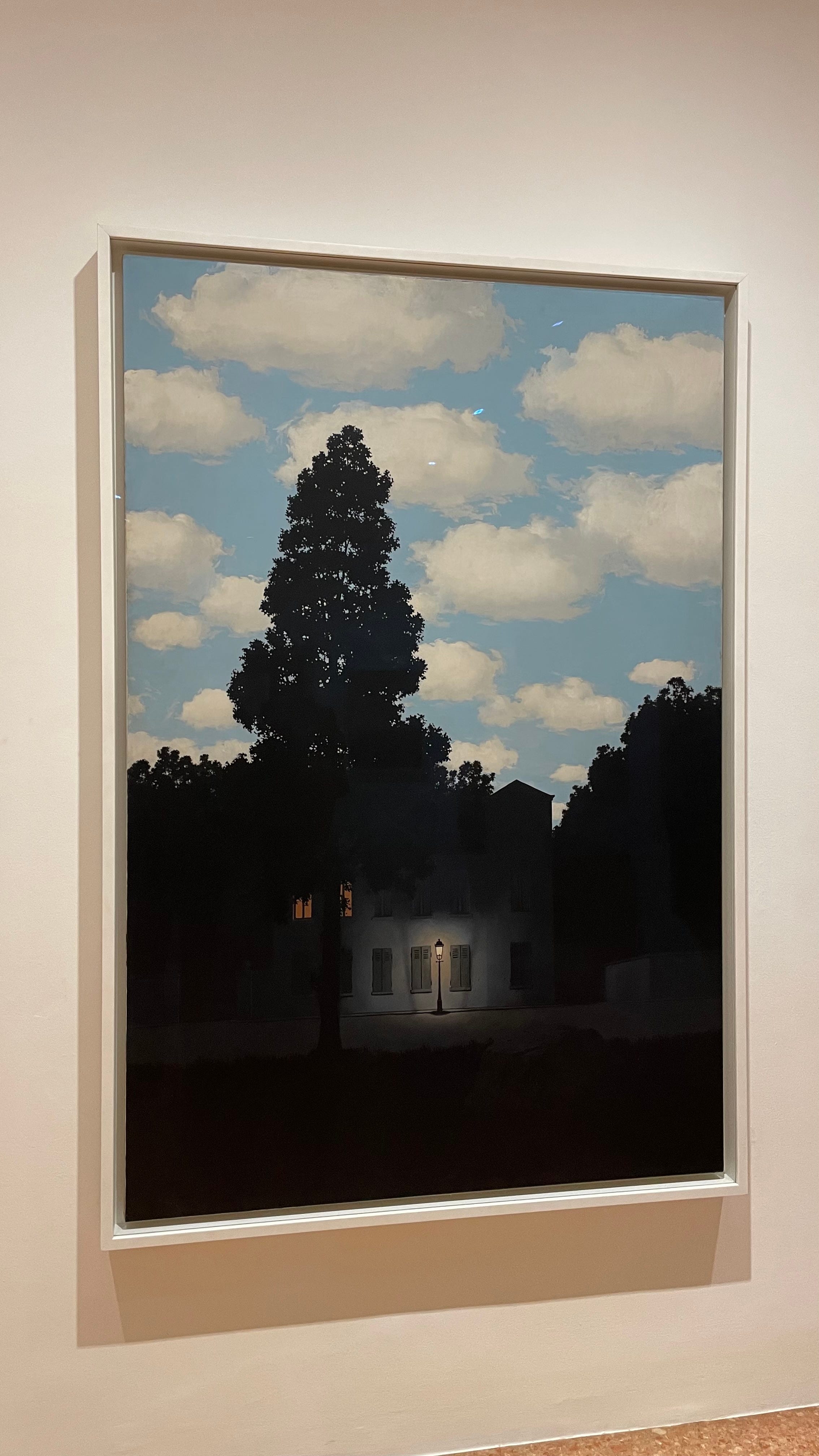 Basically, it was a house in the nighttime while the sky behind showed daytime. There is a solitary streetlamp in the middle of the painting that lights up the house in an ethereal way. The skill required to paint something like that is unimaginable to me.