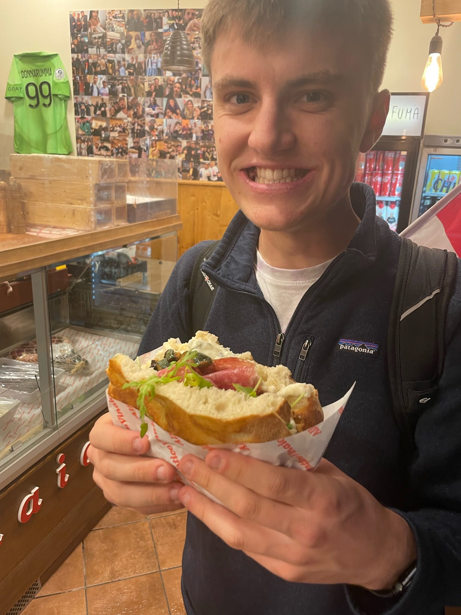 The sandwich shop was called All'Antico Vinaio and was absolutely amazing. Delicious Mediterranean sandwiches, extremely cheap prices, and even Donnarumma ate there. That place deserves a Michelin star! We ate under the cover of a random building because it was pouring rain, then walked over to the hostel to check-in.