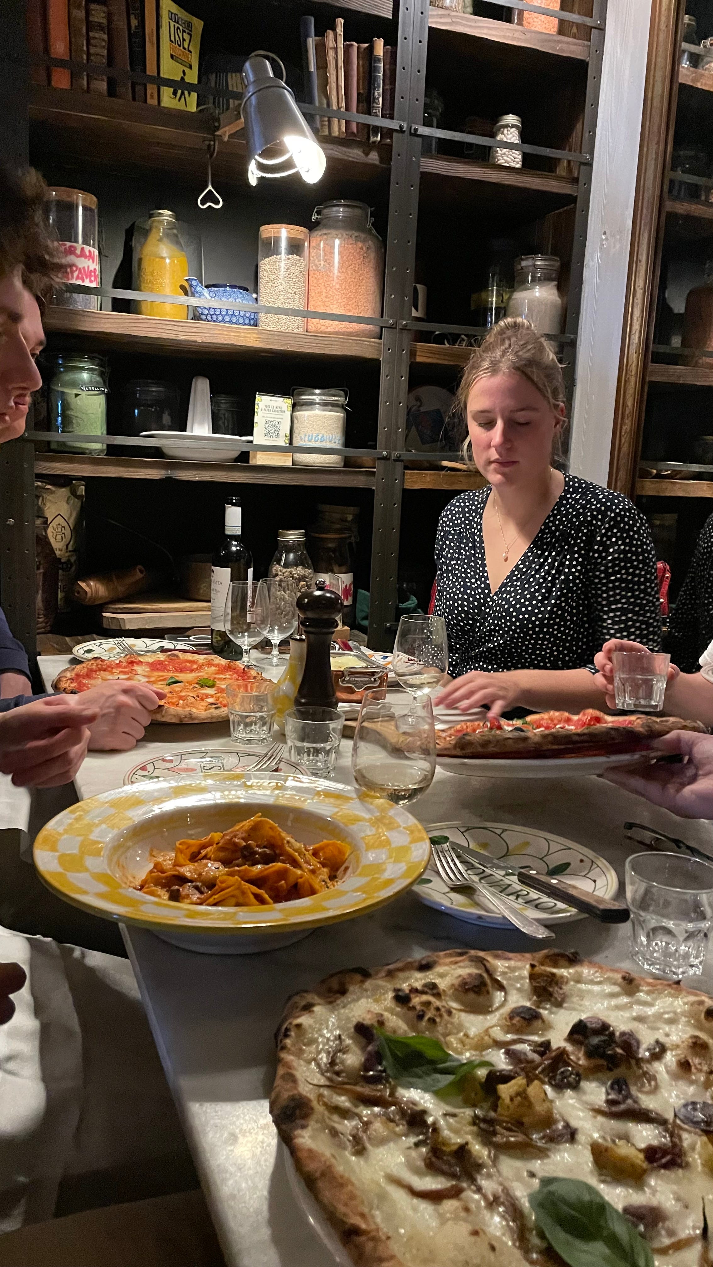 At Joe’s, we just chilled for a bit. He called his mum, I called mine, and we ate raw pasta at Joe’s insistence. Around 8:30, we went over to Emma’s to meet her, Alex, and Ben for pizza at a lovely local shop. The vibes were great, but I dipped for a solid 45 minutes to catch up with my sister on the phone.