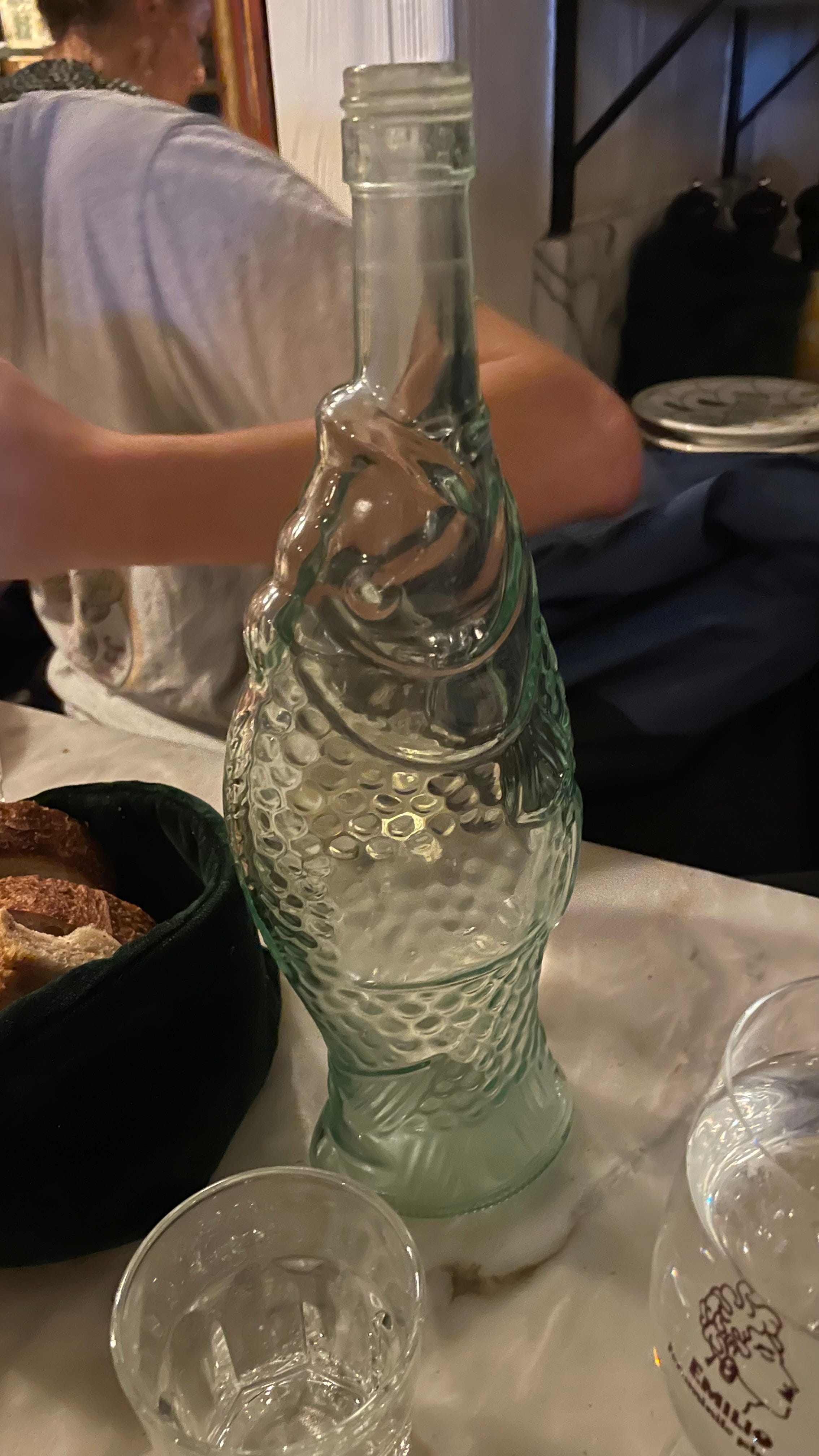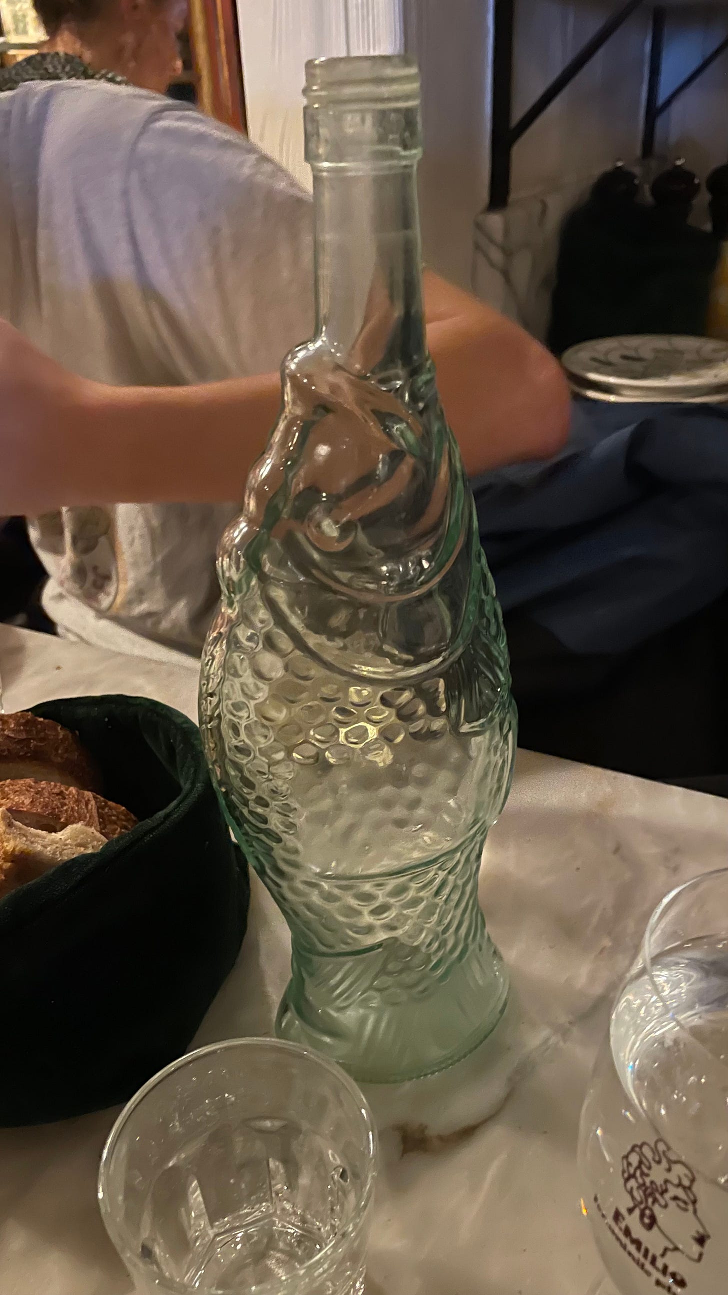 The pizza dinner was delicious. Massive pies, delicious cheese, and water pitchers in the shape of the fish.