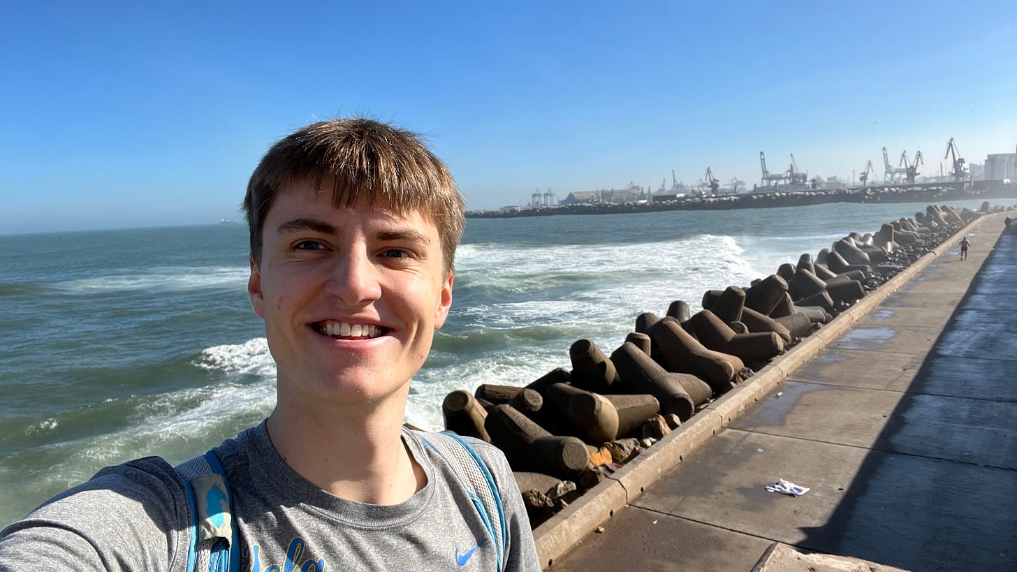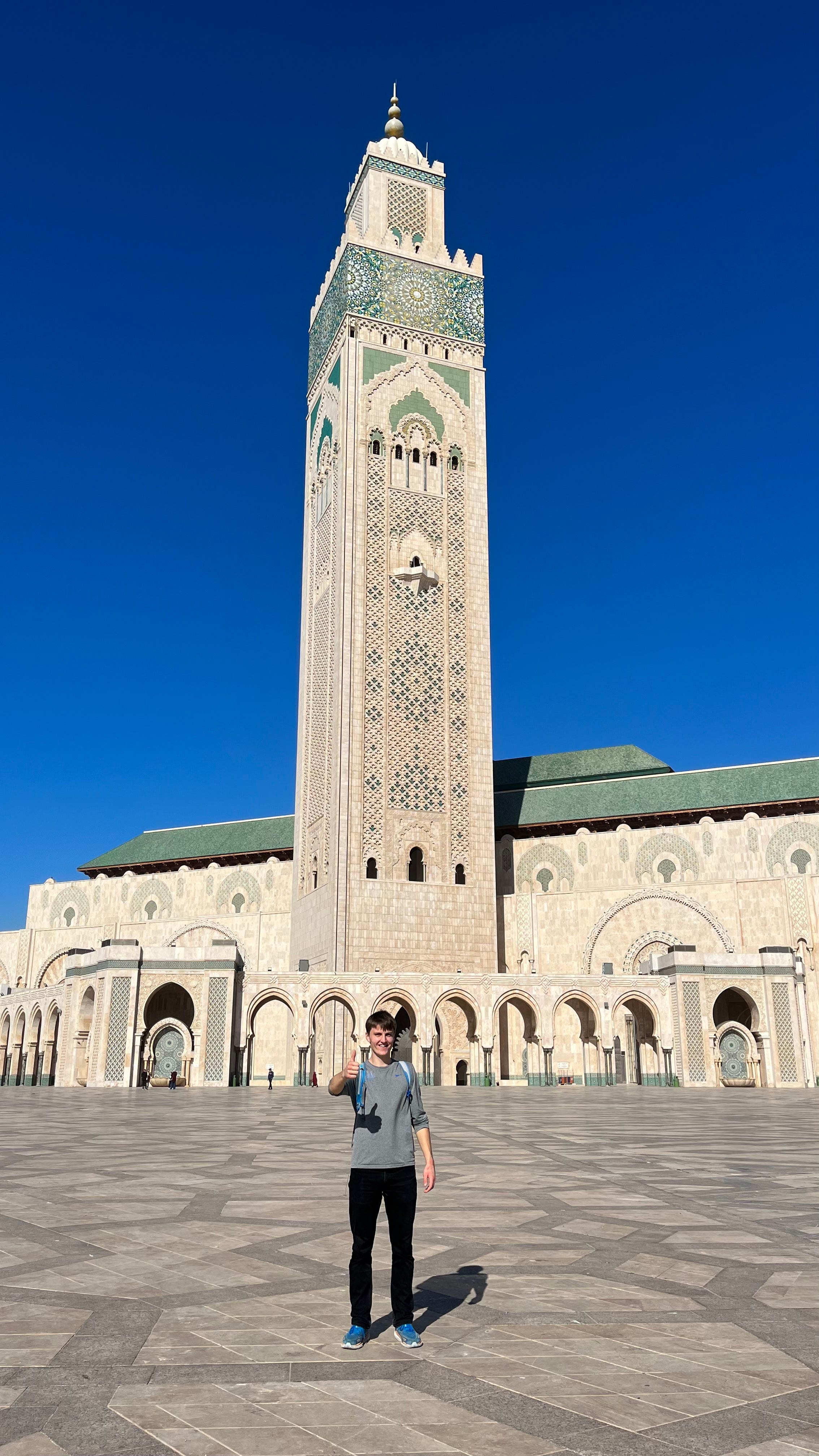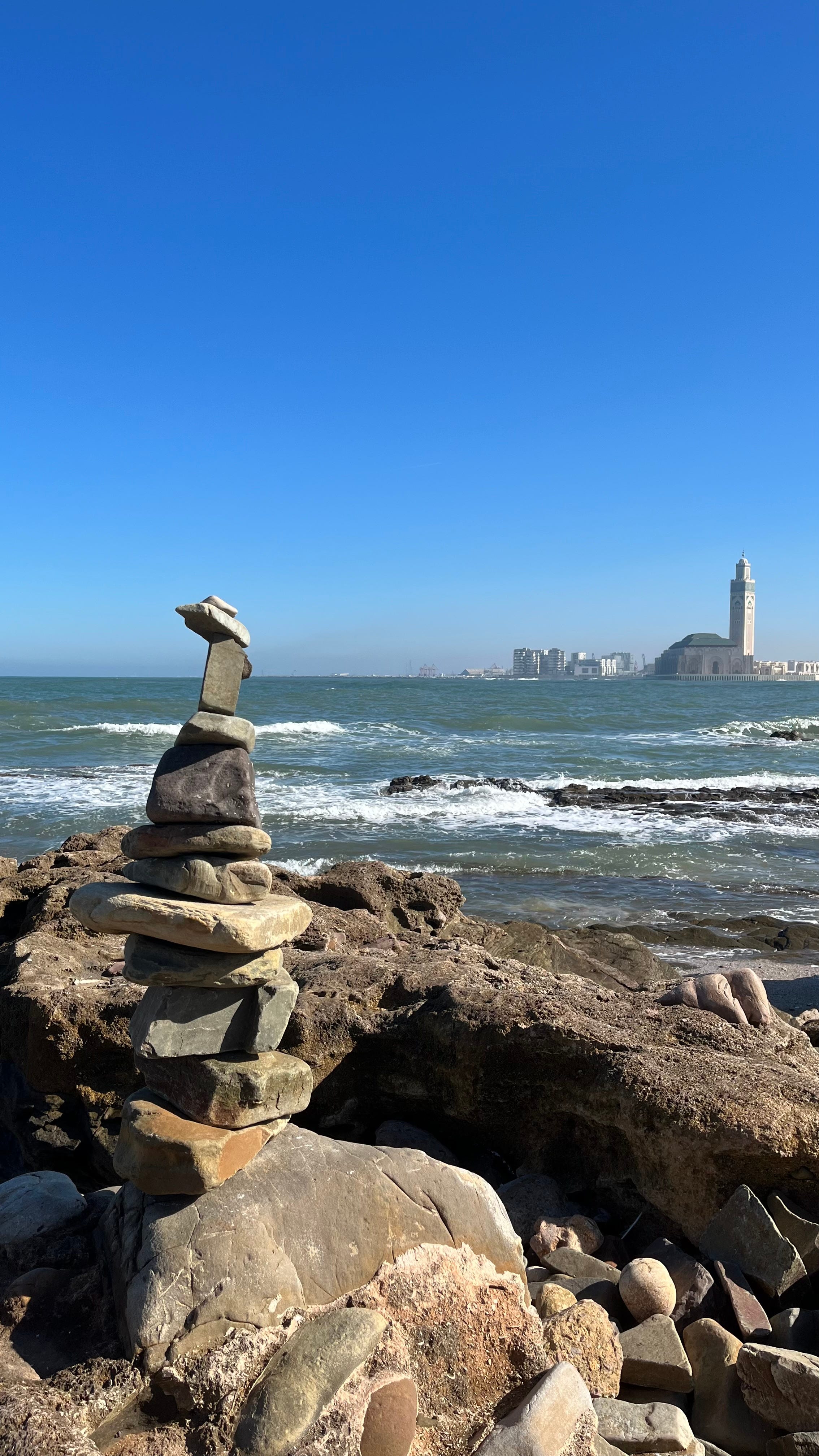 I eventually made it to the lighthouse and built a rock tower by the beach. Something I have found quite unfortunate about Morocco is that there are very few trash cans on the streets and not many dumpsters, so as a result, all the trash ends up on the streets and beaches of the city. As a result, this beach by the lighthouse was the most polluted beach I have ever seen. What was particularly sad was that just near this massive mosque that cost tens of millions of euros to build were many slums where the Moroccans lived. The money of Morocco is not being well prioritized by the king, it seems.