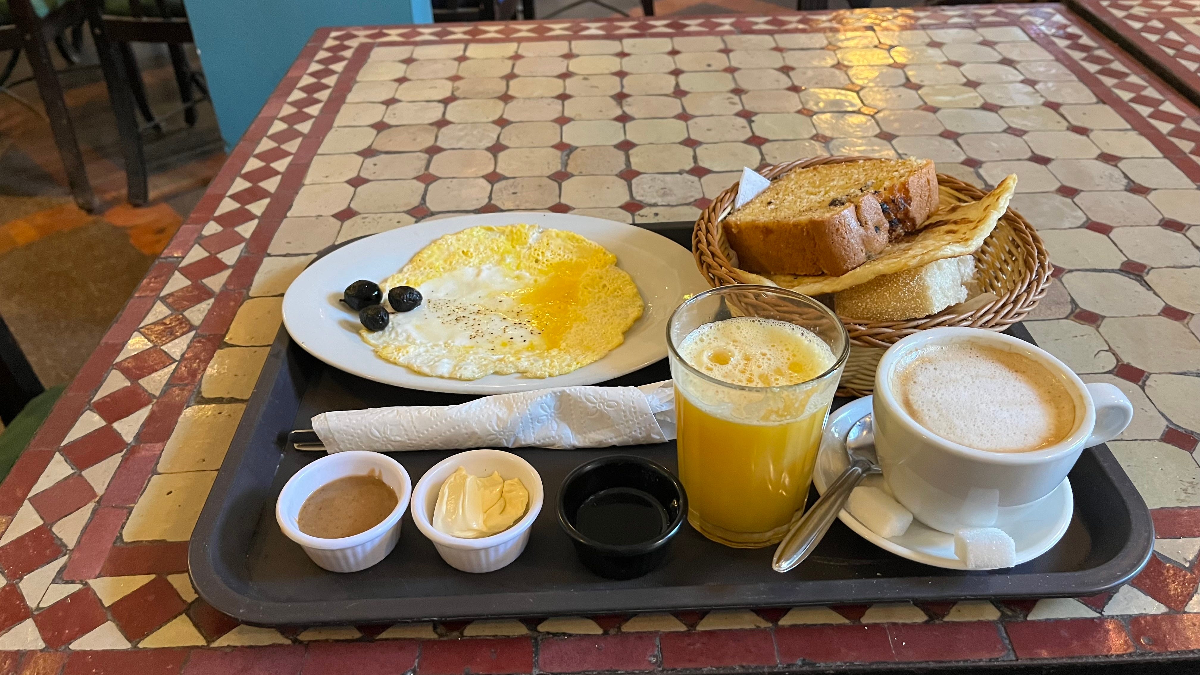 I read on Wikipedia the articles about Morocco and Casablanca so that I can be prepared for a day of exploration, then I headed downstairs for breakfast in the lobby. It was a full breakfast for 30 dirham, and it was so fresh and delicious! Great orange juice, bread, and eggs, with lots of jams and sauces.