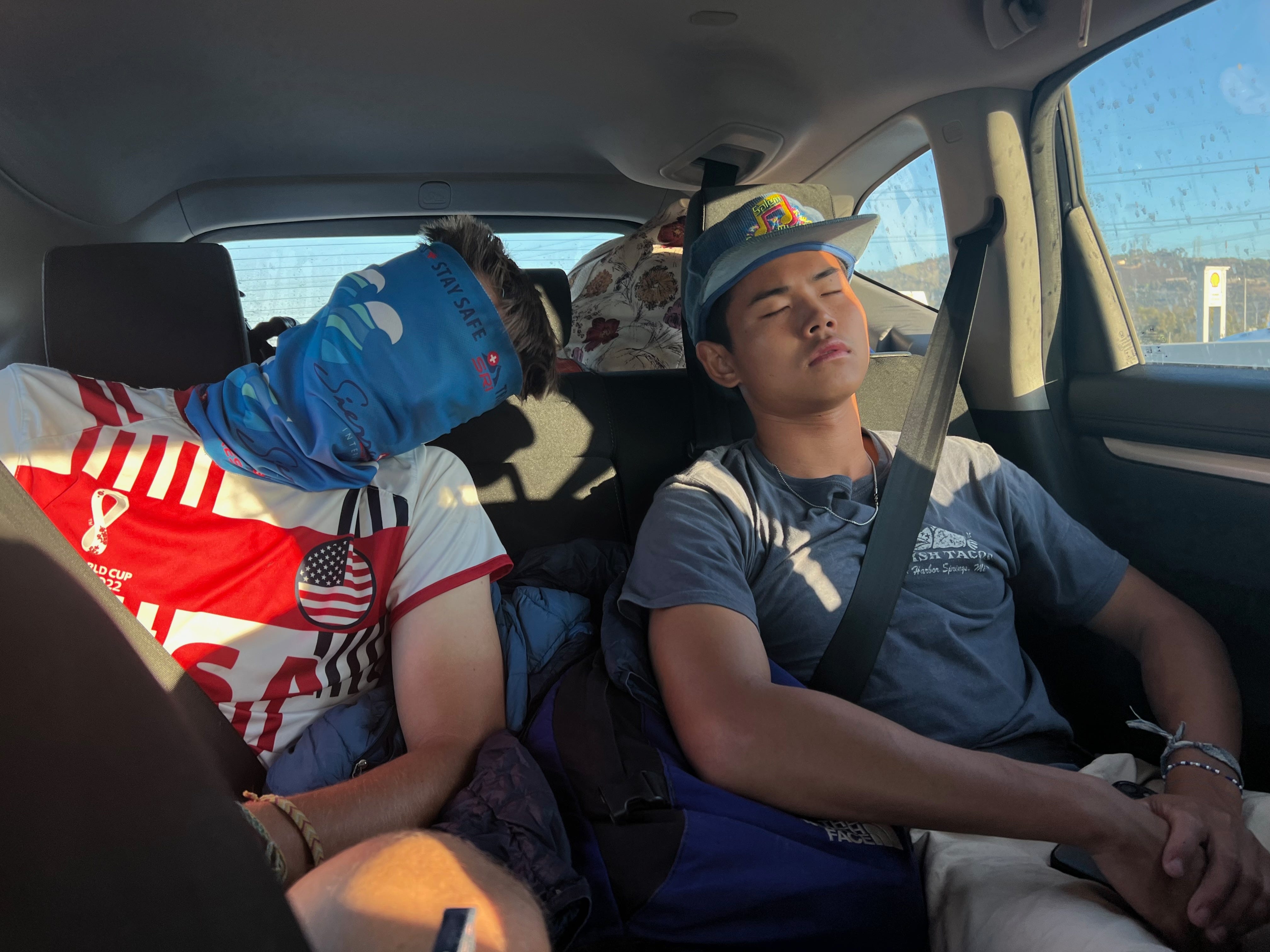 We reminisce on a good trip, head back into the cars, and drive back to UCLA uneventfully. Dylan and I were completely cooked from leading such an epic trip, so the entire drive back to UCLA went something like this: