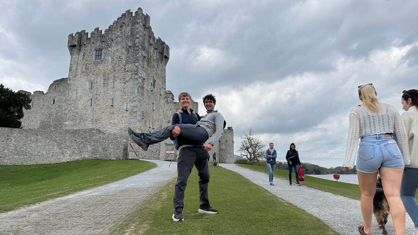 After a few hours, we arrived at Ross Castle, a big fancy ruin in the middle of the countryside. We got some great pics outside of it, then looked around the interior â they wanted us to pay 10⏠to get a private tour of the upper rooms, but when we heard that we wouldnât even be able to get on the roof, we happily stayed with the free exhibit and called it a day. Weâd rather spend that money on a pint, thank you very much!