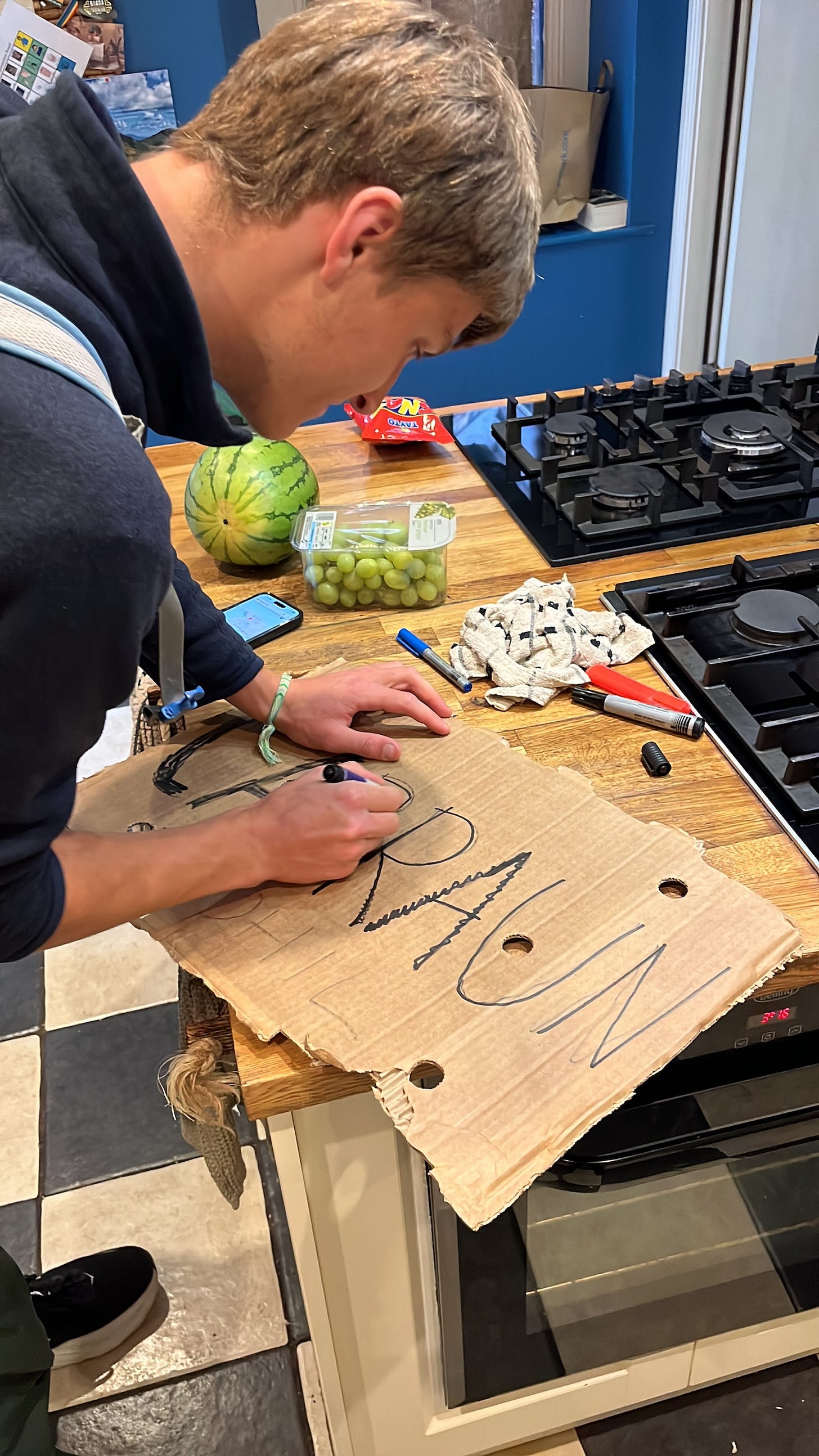 We made a nice little sign for an extra piece of cardboard we found in the hostel, packed my hiking backpack, bought some groceries17, grabbed some quick lunch at a nearby restaurant, and walked out of town to find a nice hitchhiking spot.