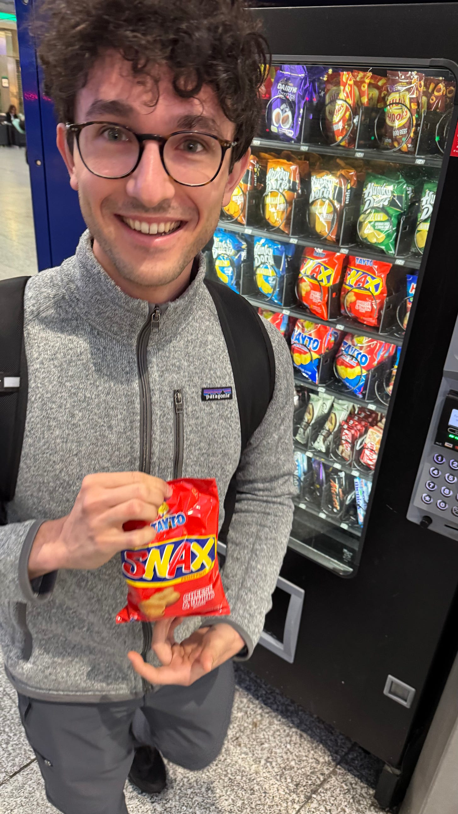 We got breakfast at the station14, and had a bit of time to kill before our train departed. Luckily, we found a vending machine that had a bag of very loose chips (crisps), which Federico knocked down after ramming his shoulder into the glass a few times.
