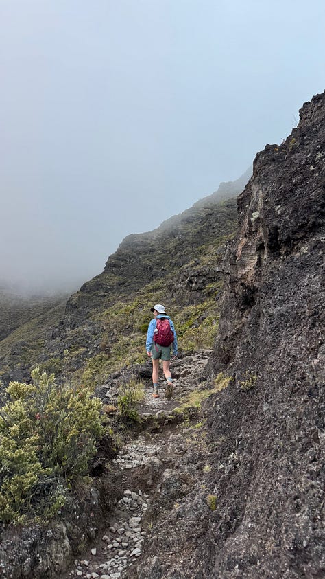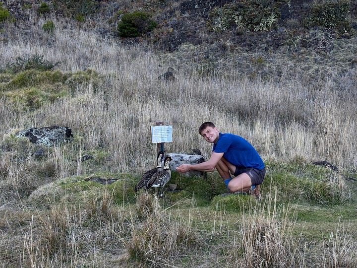 Nene geese are the state bird of Hawaii, endemic to Hawaii (they only live there), and are, in fact, the rarest goose on Earth (~3500 in existence). This trip was my first time seeing them, they were so cute and fuzzy and cuddlesome I love them. We saw a few on the park road driving up to the summit, and two more in the Haleakala Crater on our hike. There are three wilderness cabins in the crater, and upon reaching one and turning on the water faucet, the two geese ran over to me and began drinking out of my cupped hands. Brooke reported that after this happened, “you were the happiest I’ve ever seen you”, and I subsequently and promptly edited the Wikipedia article on the nene goose to include a Gallery Section. Perhaps you’ll even recognize the human tourist: