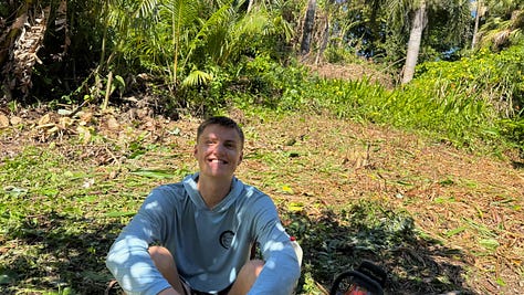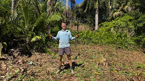 As for the work itself, it was mostly clearing land on their property. Ron and Shawn’s place gets a ton of rain, which means lushness and greenery like you’ve never seen… and tons of overgrown vines and plants. Over the course of 7 days, we cleared ~100 square meters of land (from complete overgrowth to a clear field!), where they’re planning to plant some citrus trees and breadfruit! It was my first time using both a sickle (the tool on the Soviet Union flag) and a gas-powered chainsaw, which was both extremely fun and time-saving. Chainsaws are great! Plus, over the course of the work stay, Ron explained the general principles about how a chainsaw works (2-stroke engine, baby!) and I learned how to get it started. Did I mention it was fun?